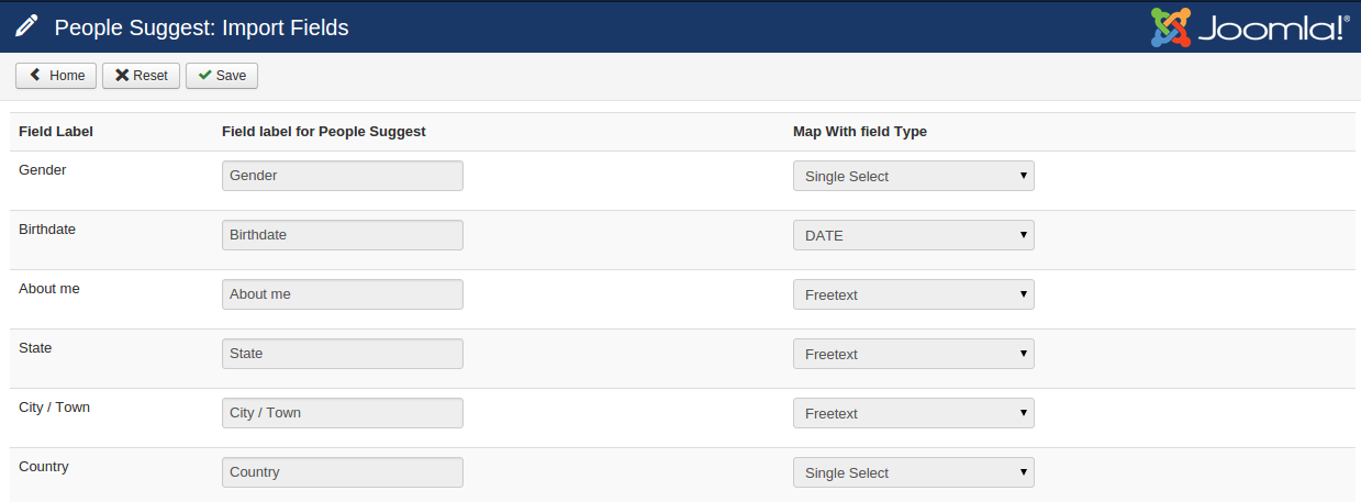 To configure Import Fields, login to the admin & go to Components> People Suggest > Import Fields. Map Fields with the field type as shown in following screen shot.