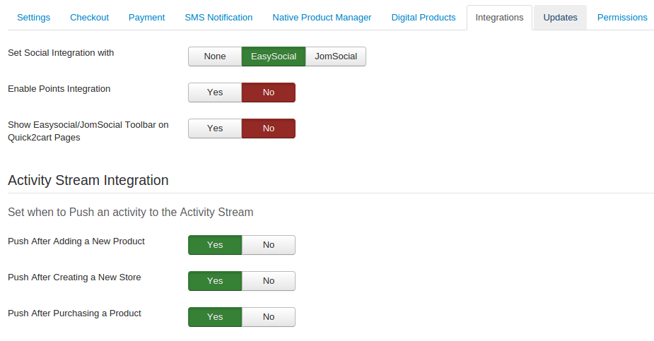 According to set integration.You can use Quick2cart with Easy Social, JomSocial or simply with Joomla.