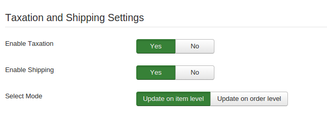 According to the selection, tax and shipping charges will be applied to individual item level or order level. According to the mode of selection, you have to enable the respective plugin from plugin manager.