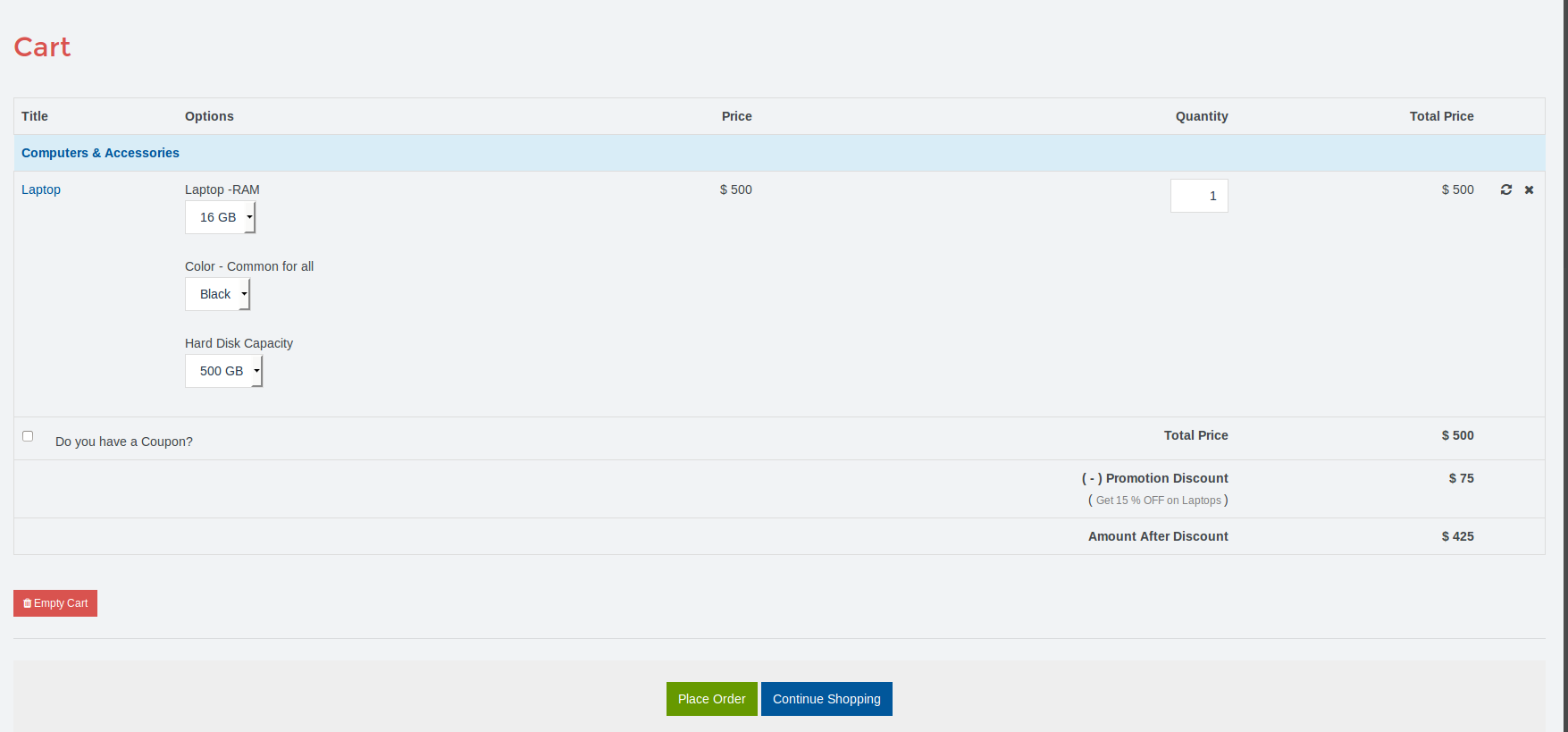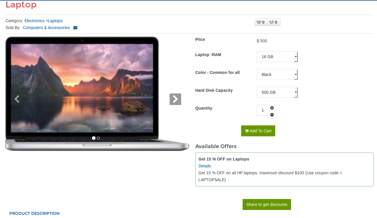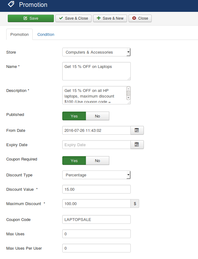 Coupon Required:- The store owner can create the normal promotion as well coupon based promotions. For coupon based promotions, the buyer has to enter coupon from checkout view. If the coupon is valid then only promotion discount will be applied on store cart item only.