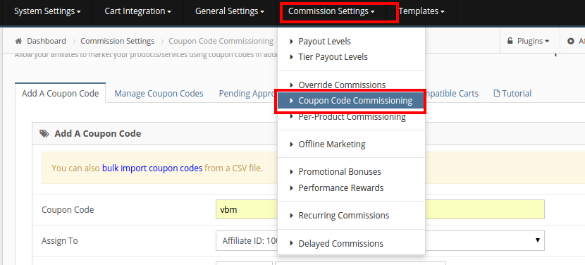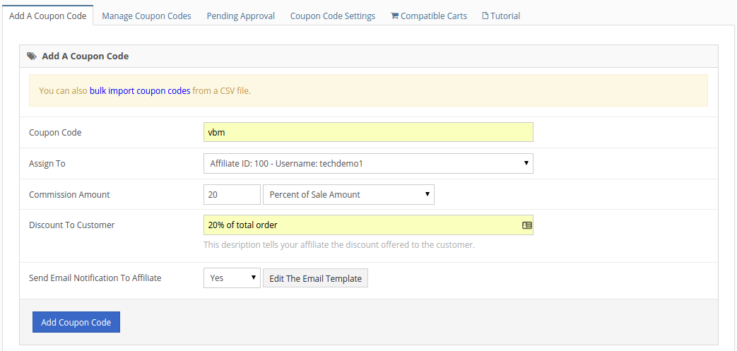 This feature will allow you to assign an affiliate to a coupon code in your cart/checkout system. When that coupon code is used during checkout the assigned affiliate user will receive a commission.