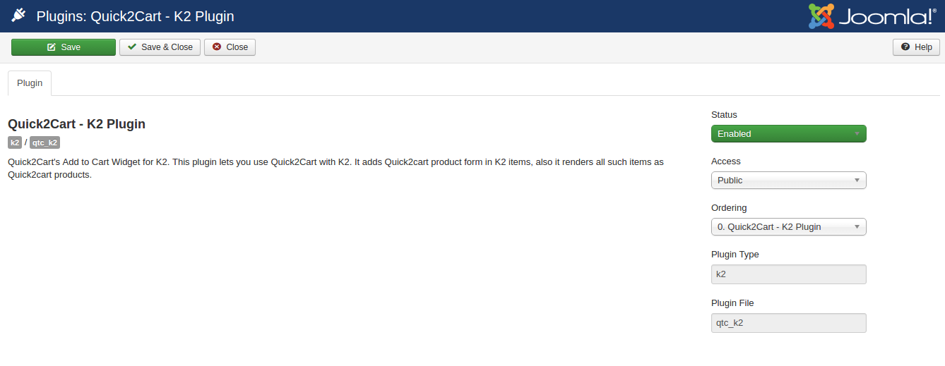 - Make sure the K2 type plugin - Quick2Cart K2 Plugin is enabled.