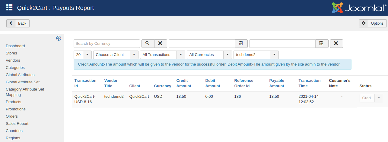 The reports carry the credit and the debit transactions. The credit transactions are the successful orders and the debit transactions are the payouts done by the site administrator.