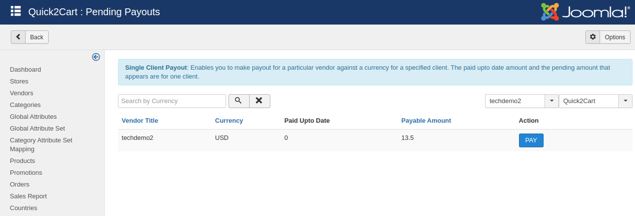 The payouts feature is available only for the administrator but the reports can be viewed by the administrator as well as the vendor(from the front end).