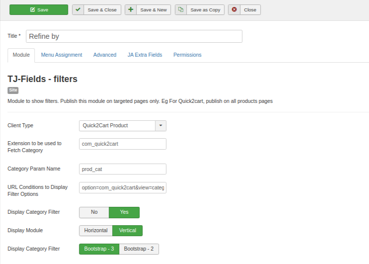 To publish the filters module from the backend, go to Extensions->Modules->Set Select Type as TJ-Fields - filters from the dropdown. Publish and configure the module in the desired position and location.