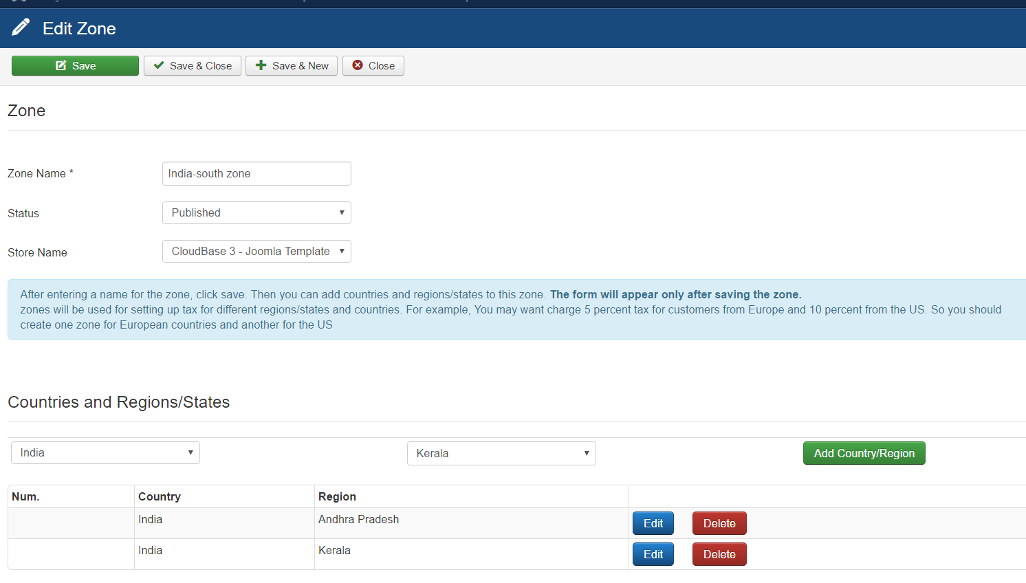 Zones are a collection of Geographical areas having similar requirements from a Shipping or Taxation perspective. Creating Zones makes it easier to handle rules enmasse instead of having to do it per country or per state. Zones need to be setup on a per store level.