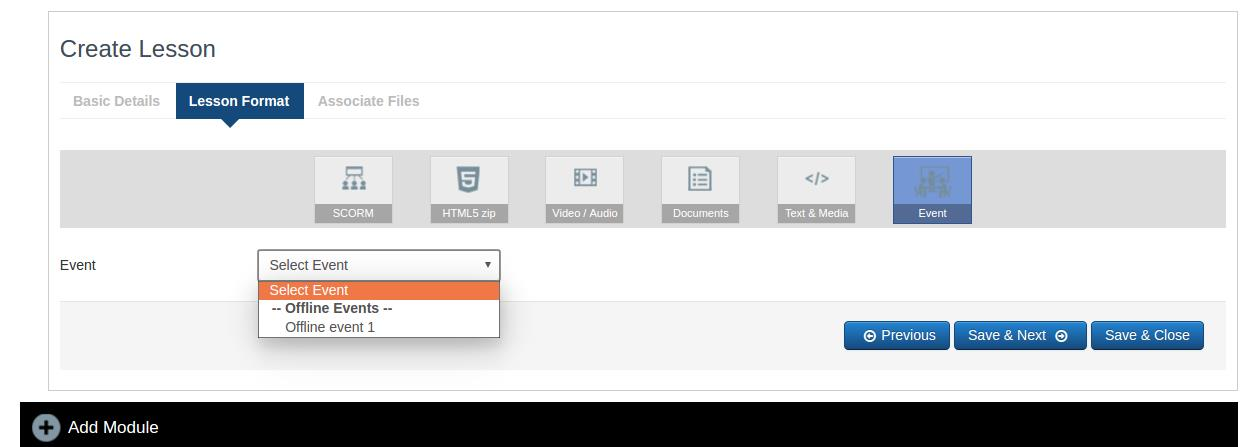 - Create course or existing course goto manage material create lesson and select event as lesson format.