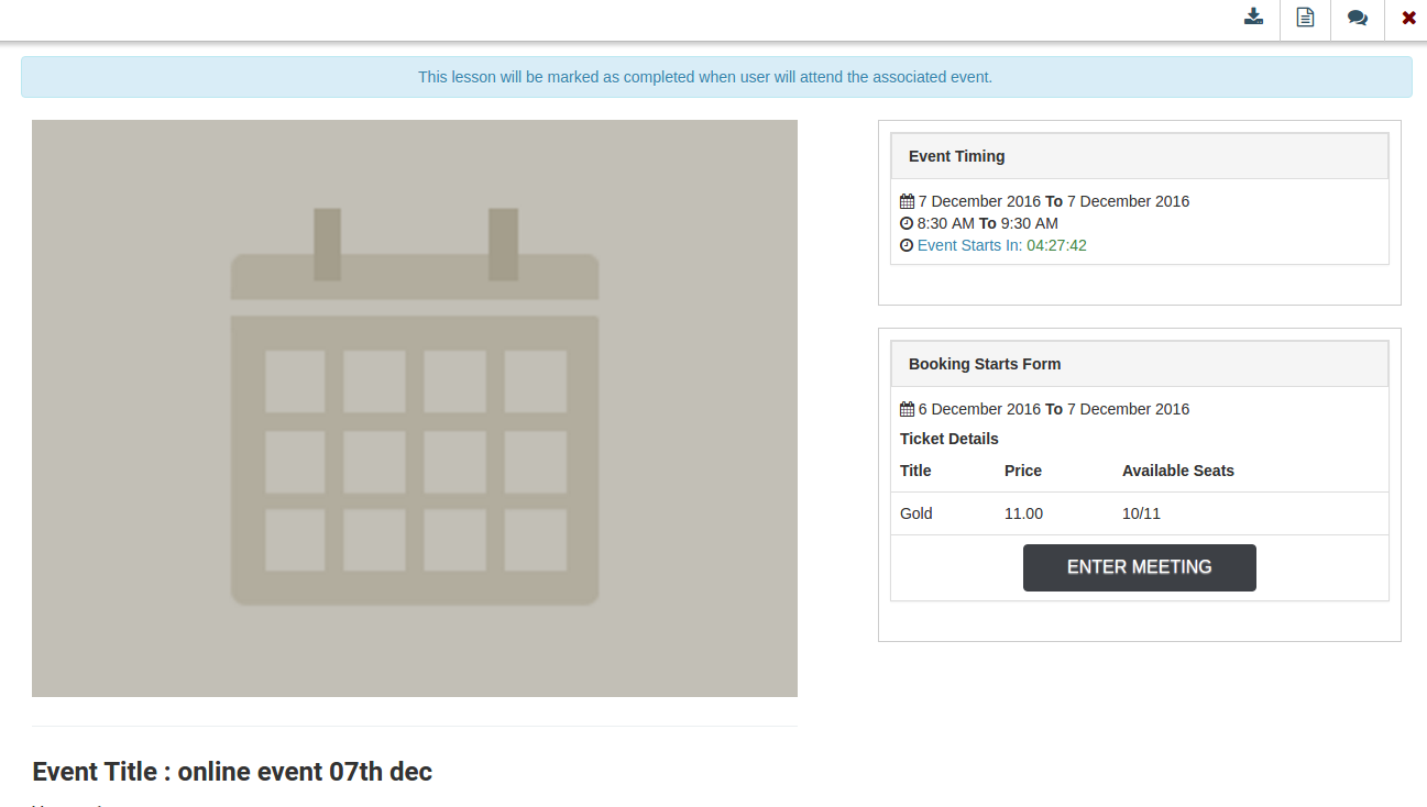 - After course enrollment by the user which has the event included, he should able to see the ‘Enter Meeting’ button for the lesson, which has included the online event.