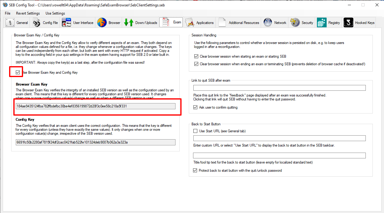 i. Check the check box for “User Browser Exam key and Config key”