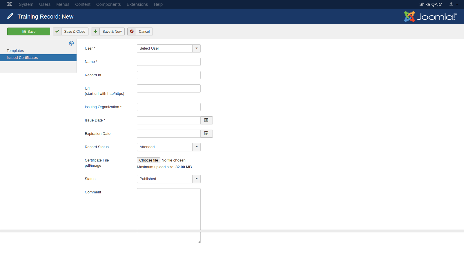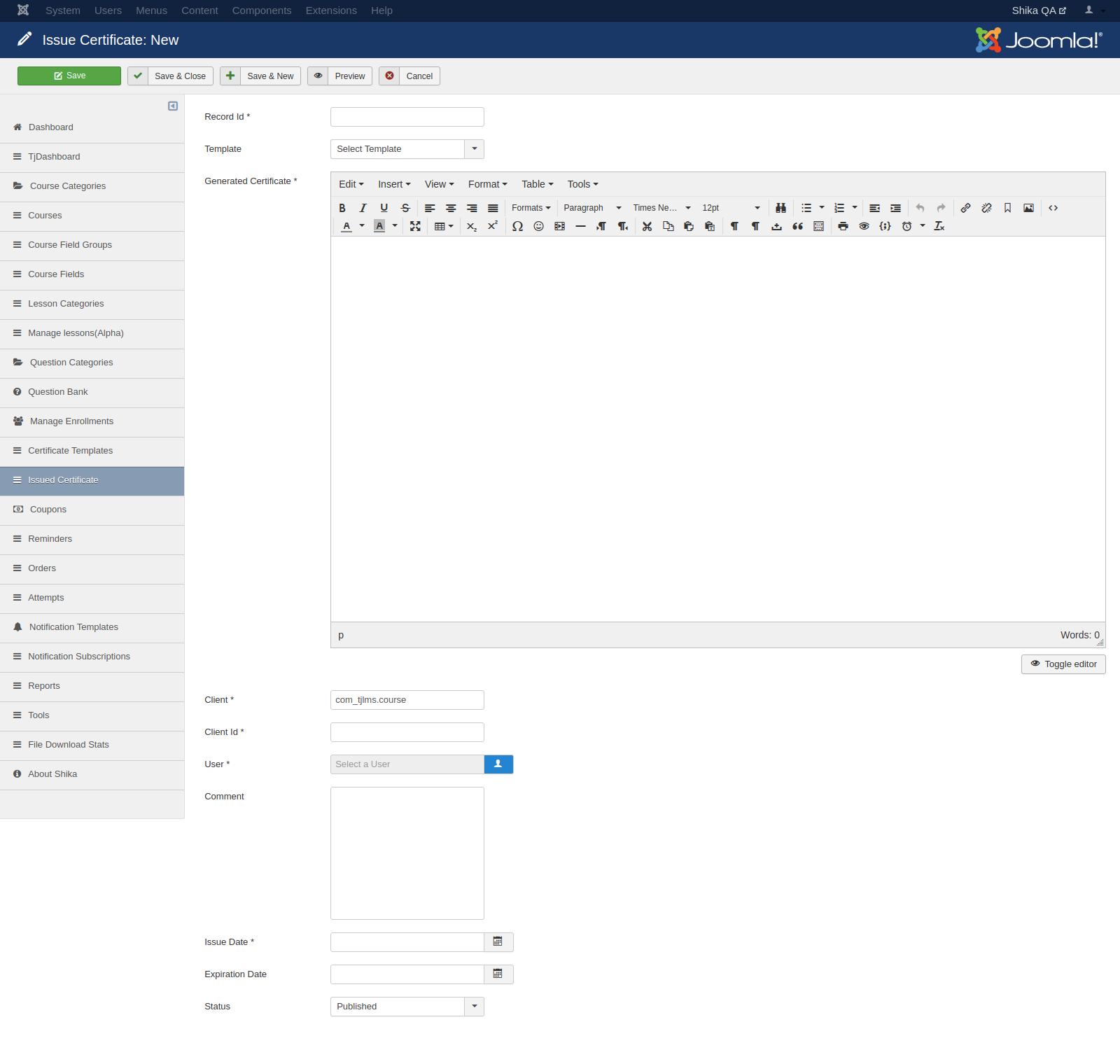 - Select Badges - This option allows you to add badges to the course. Which can be allocated after the completion of the course. In case this option is not displayed, check if “Easysocial” is installed on the site and selected as a “Social Integration” in Shika configuration.