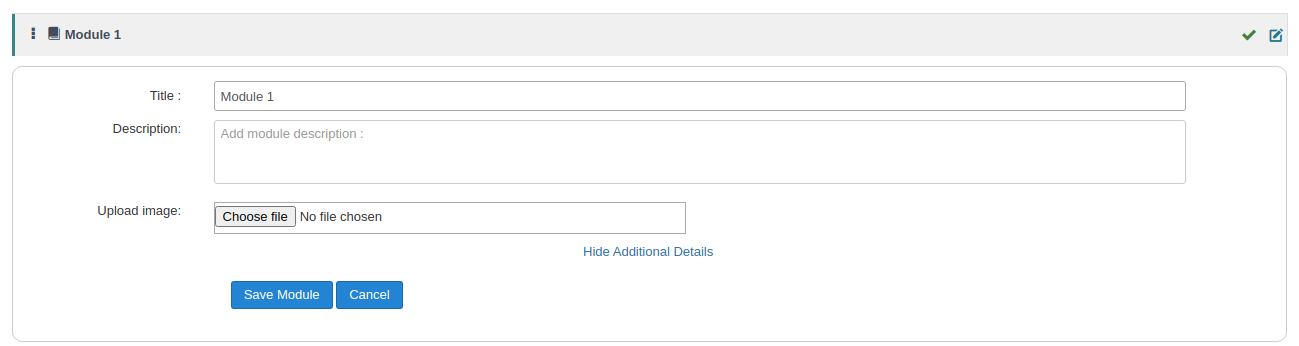 - Add Module Button - This option allows you to create a new Module. Creating modules allows the course structure to be easy and hierarchical. While creating modules, apart from Module title you can also add Module Description, and Module image.