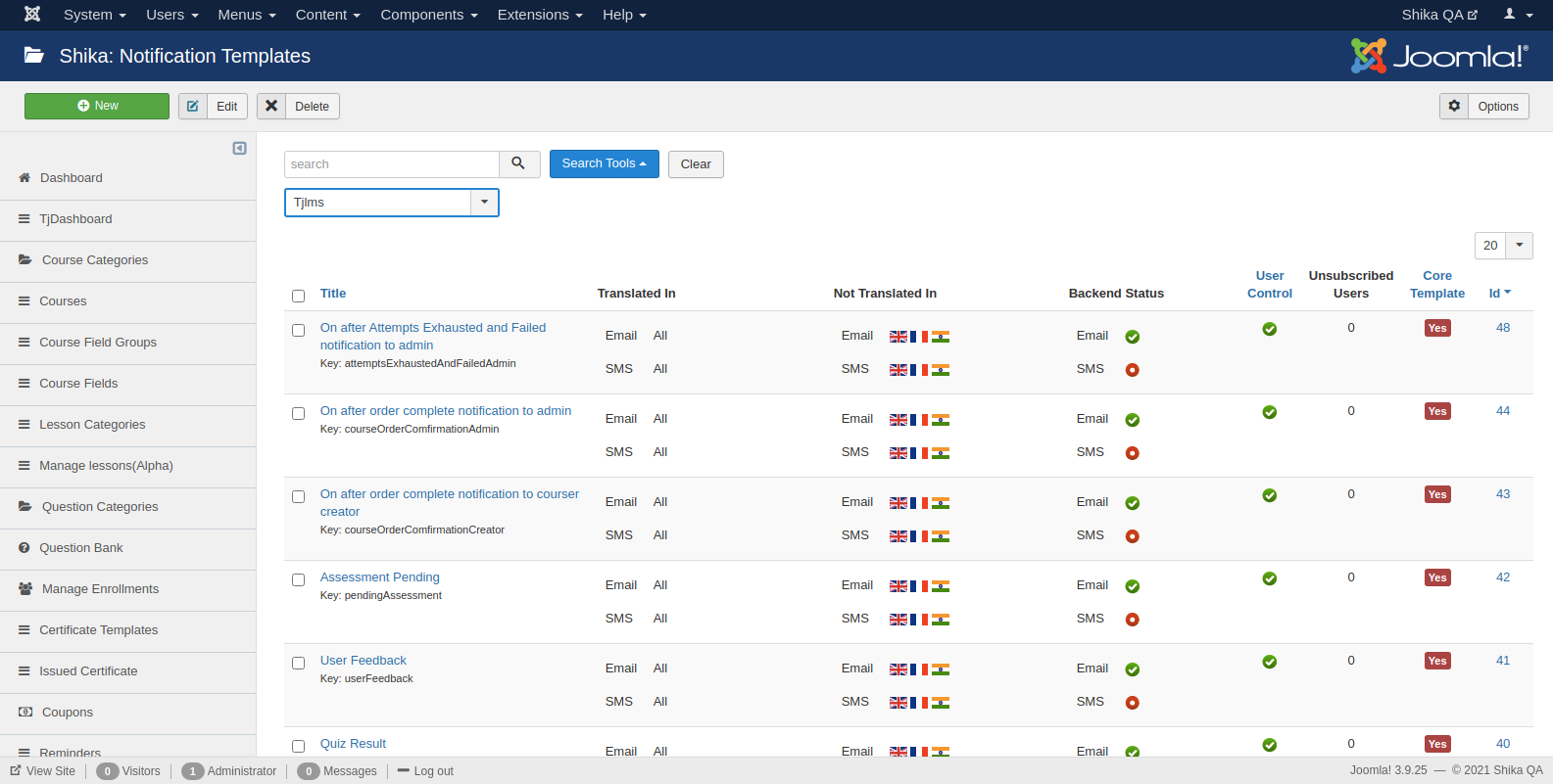 Here you will be able manage the email notifications which are to be sent to the users after their actions on the LMS. You can disable the notifications from here, in case you don’t wish to send a particular notification.