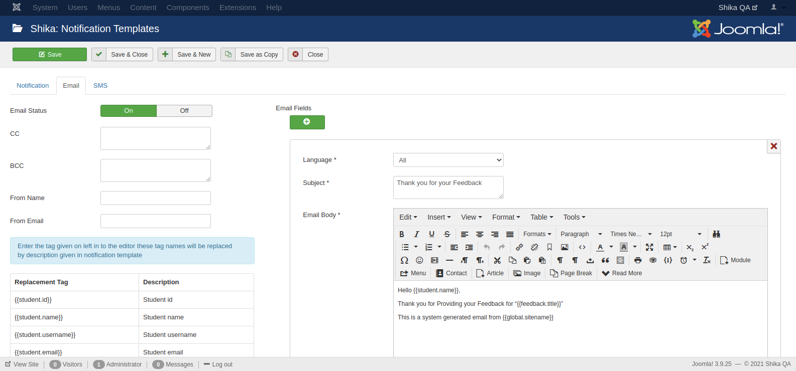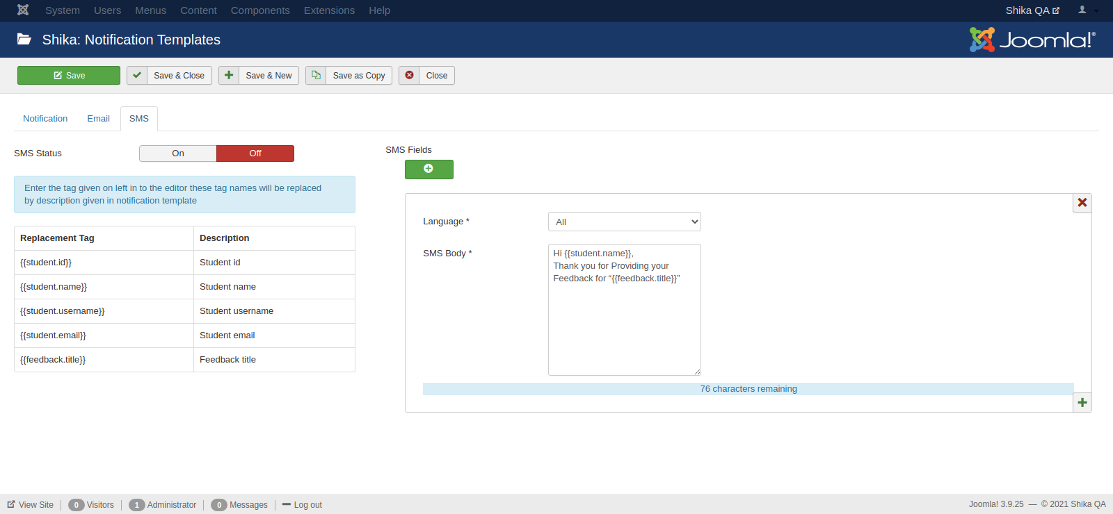 - Also, you can add multiple SMS templates for different languages (if your site supports multiple languages)