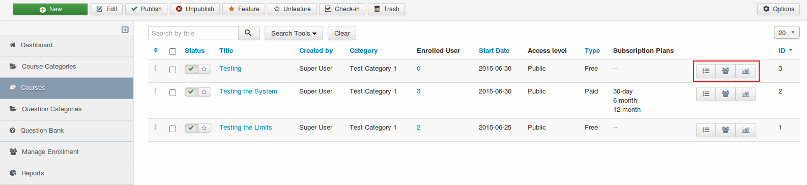On Already created courses following actions can be performed -