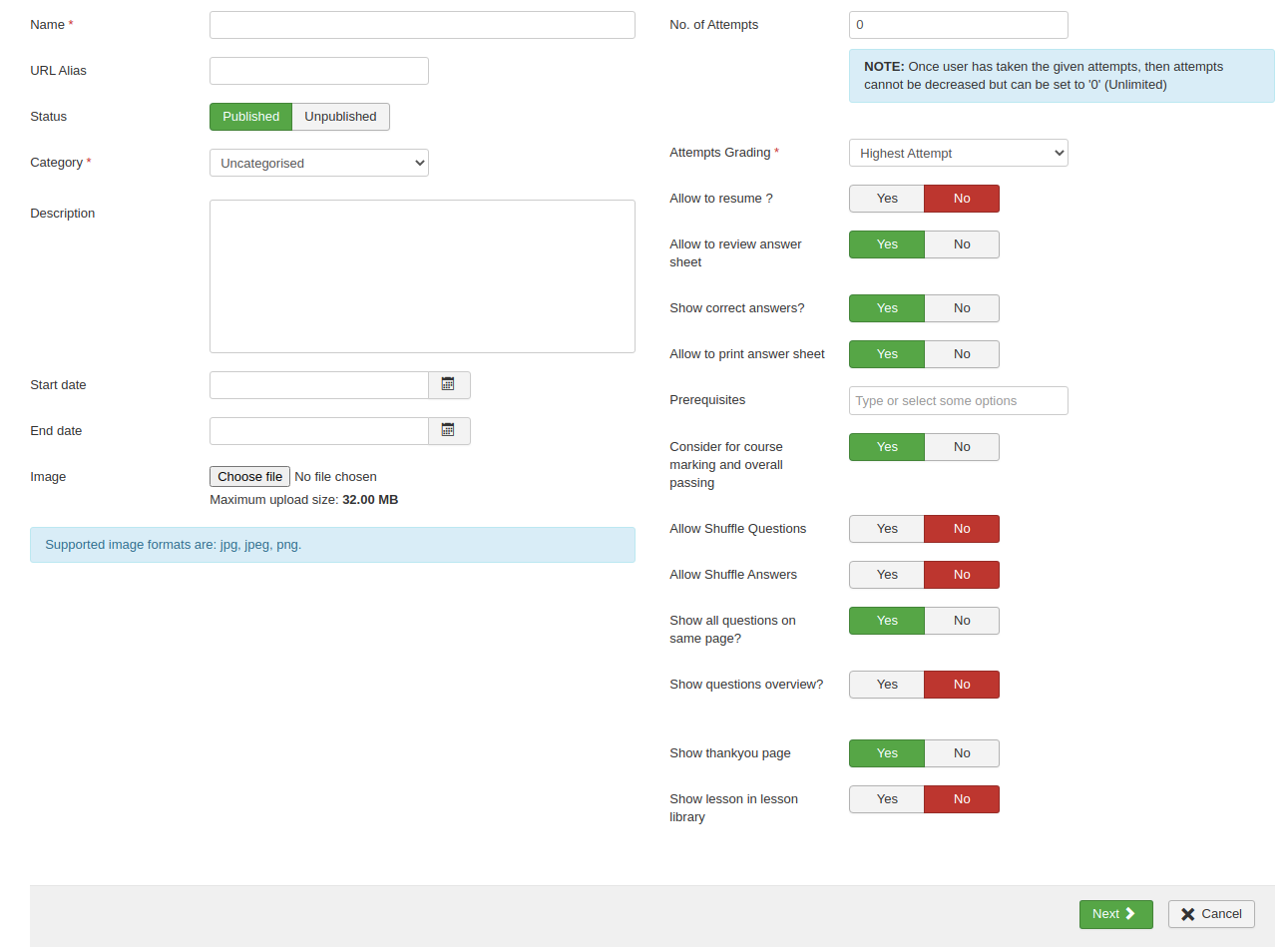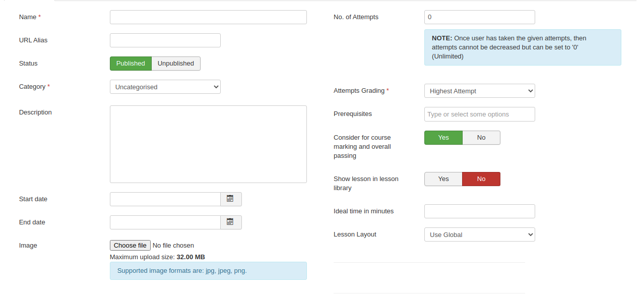 - No. of Attempts - here you can restrict the attempts which user will take for this lesson.