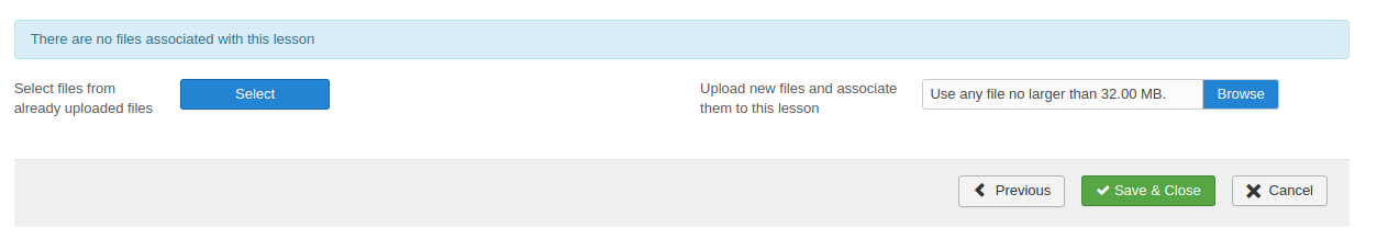 - Associate Files - This section is for uploading supporting / referenced files for the users who are attempting this lesson. These files once uploaded as Associated files will be visible to the users on the user side after launching the lesson and clicking on the “” icon from the toolbar available on the top.