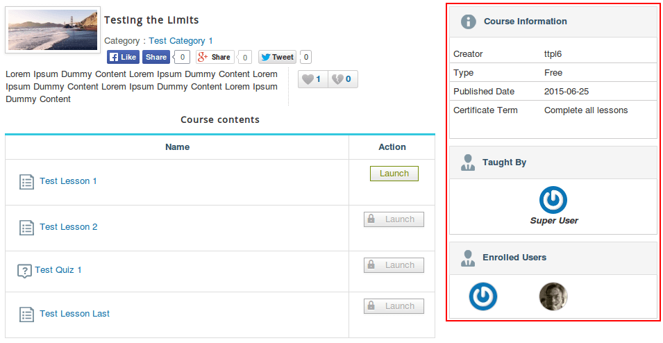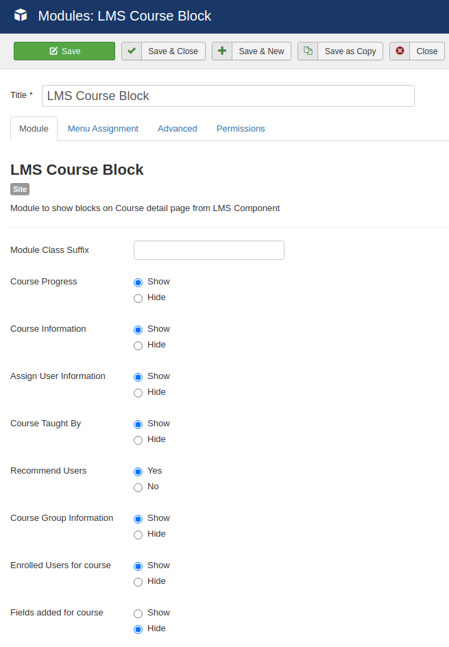 Here we can specify which fields we want to show for particular course block. Course Progress, Course Information, User information, Taught by, Enrolled users, Recommend users, Course group information are available options.