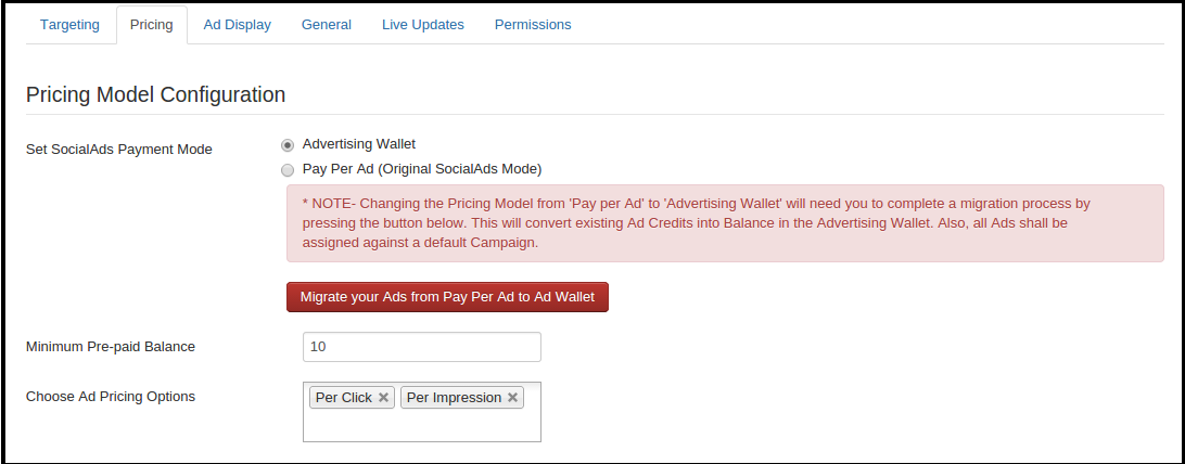 Changing the Pricing Model from Pay per Ad to Advertising Wallet will need you to complete a migration process by pressing the button below (If the button is not displayed then no need to migrate). This will convert existing Ad Credits into Balance in the Advertising Wallet. Also All Ads shall be assigned against a default Campaign.