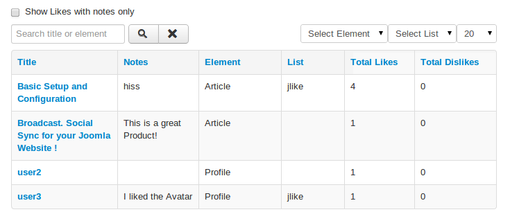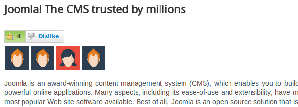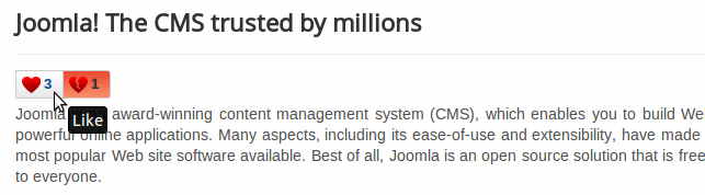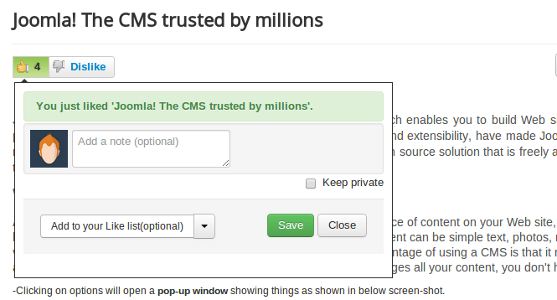 jLike lets you add like and dislike functionality to a variety of content in your Joomla site. Plus users can also add personal notes against the content and add it to their own Like lists for better organisation.